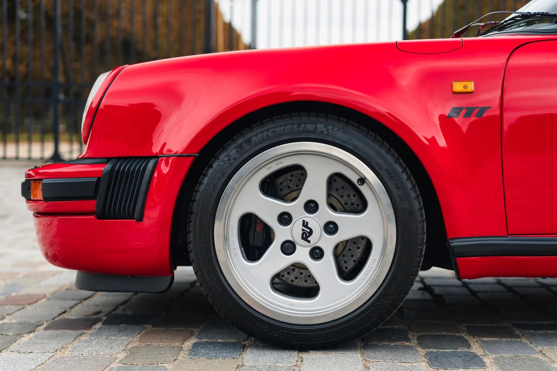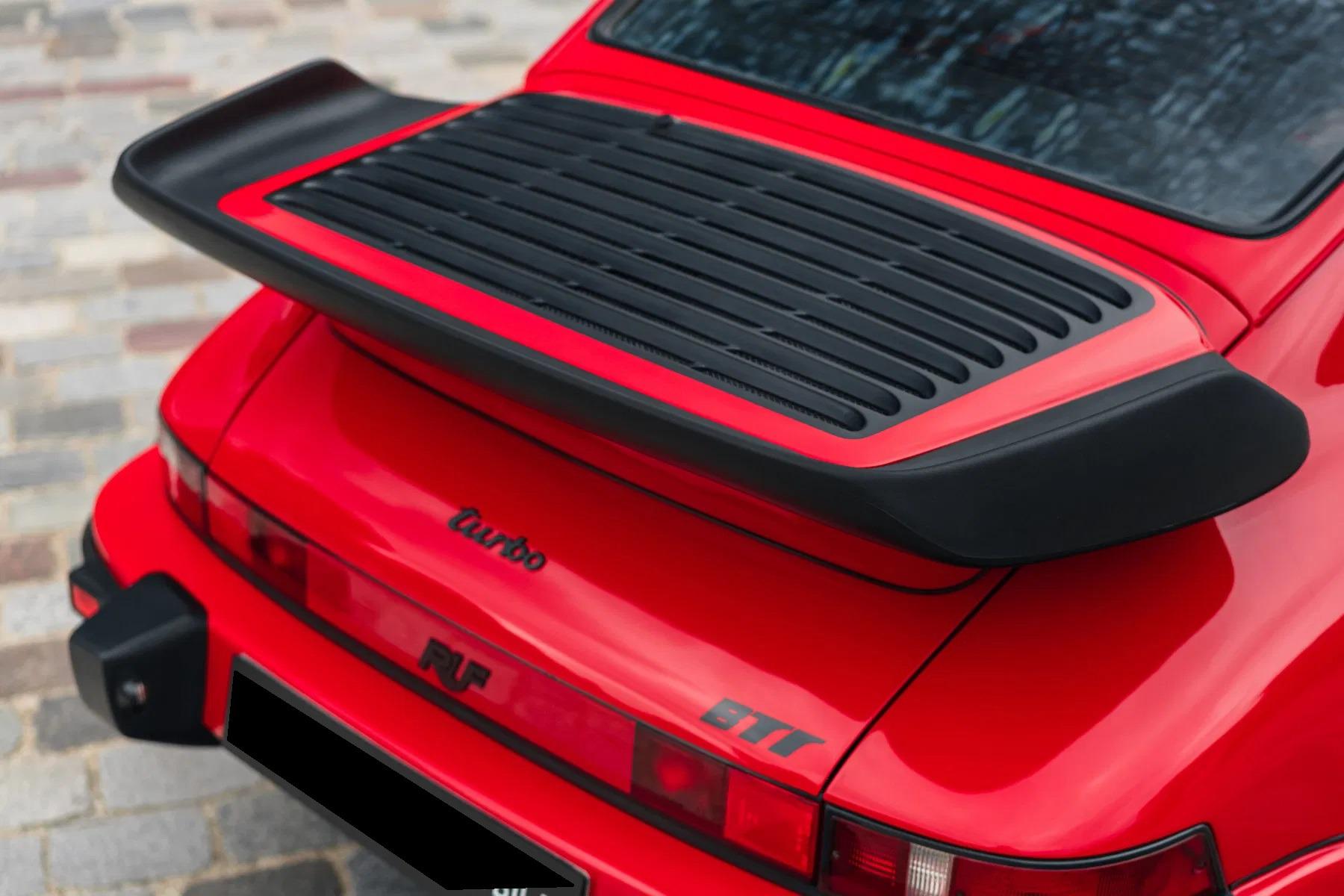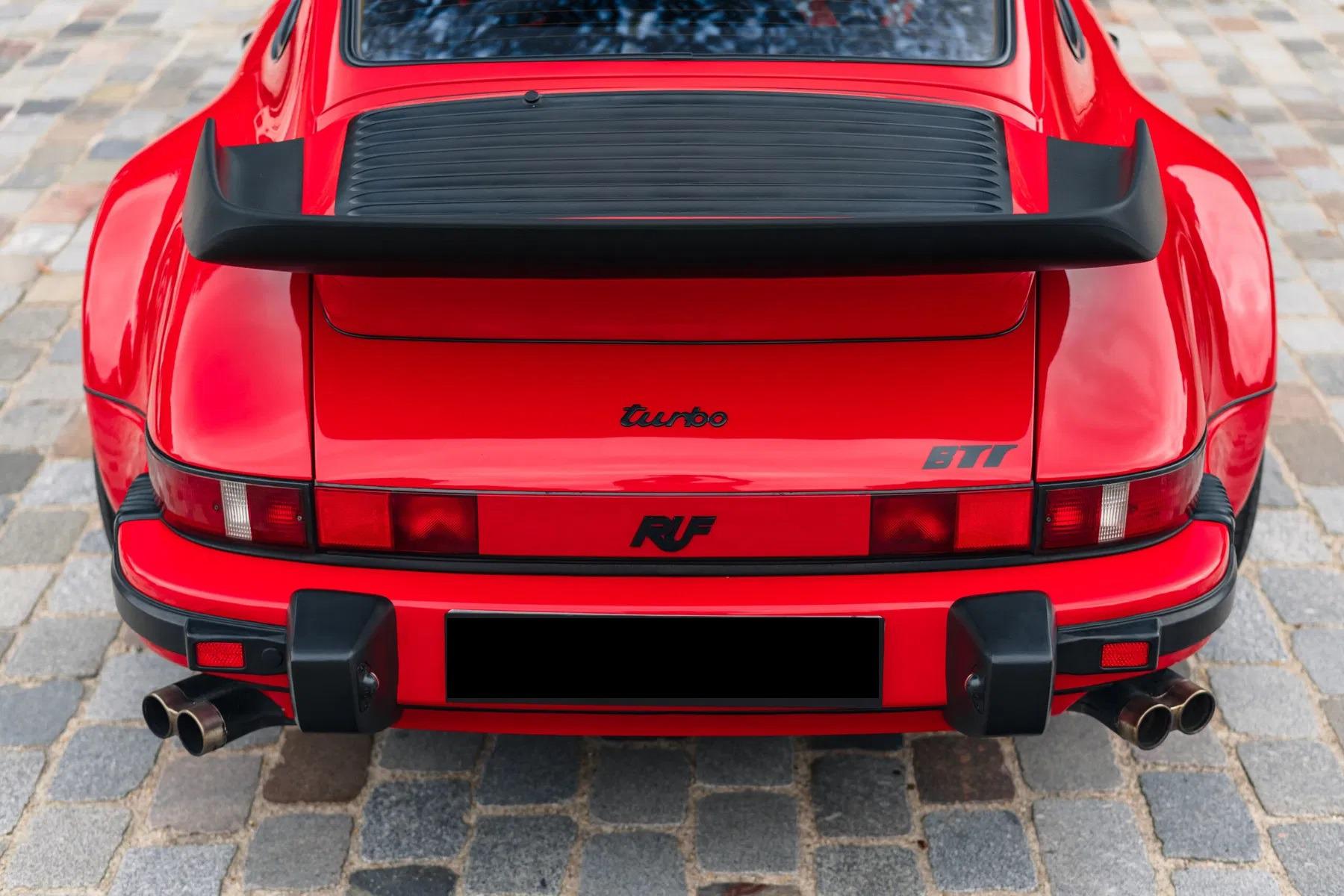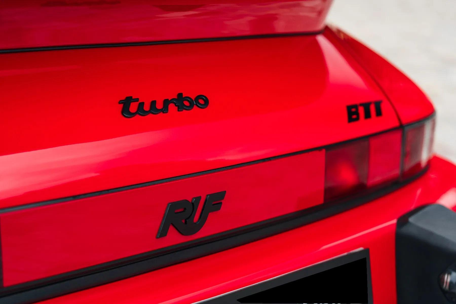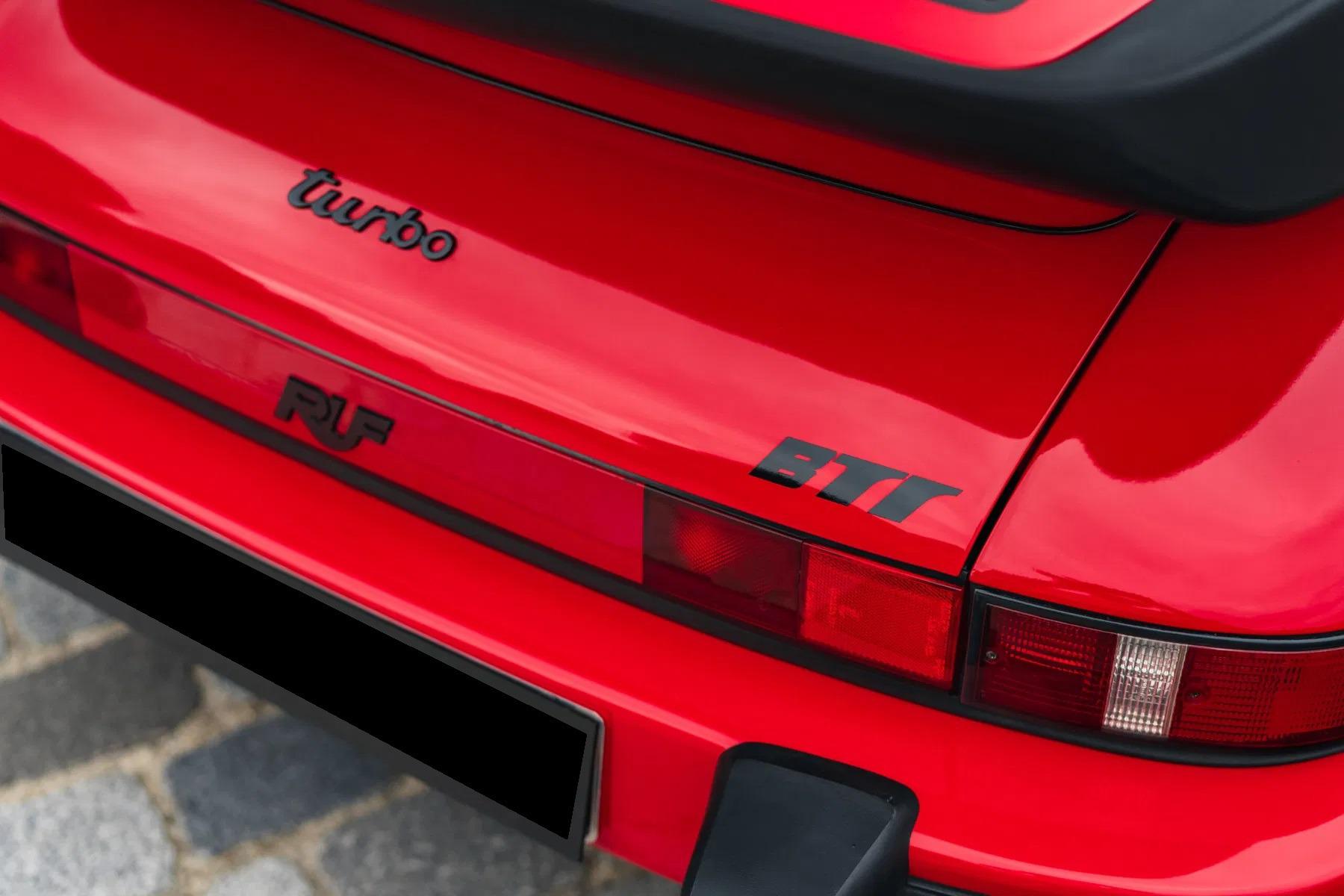 The BTR marked the beginning of RUF as a manufacturer in its own right, establishing itself as the most highly regarded of all the Porsche tuning companies. The BTR was inspired by the FIA Group B regulations of the time, utilizing a 930 Turbo as a basis to compete with the fastest products from Ferrari, Lamborghini and Porsche itself. The BTR was routinely regarded as the fastest accelerating road car at the time. The BTR utilized a 930 turbo engine bored to 3.4 liters and then fitted with Mahle pistons, RUF 935-type camshafts, RUF intercooler and a larger KKK turbo. This resulted in a power output of 374 bhp. Various other modifications to the car included enhancements to the body and interior, RUF sport steering wheel, RUF gauges, RUF suspension, RUF specific 17-inch wheels, RUF front spoiler with oil-cooler, Fog lights, RUF quad-pipe sport muffler, and a RUF five-speed gearbox. Upgraded to RUF BTR II Specification by the Official RUF Importer for Switzerland in 1992.
