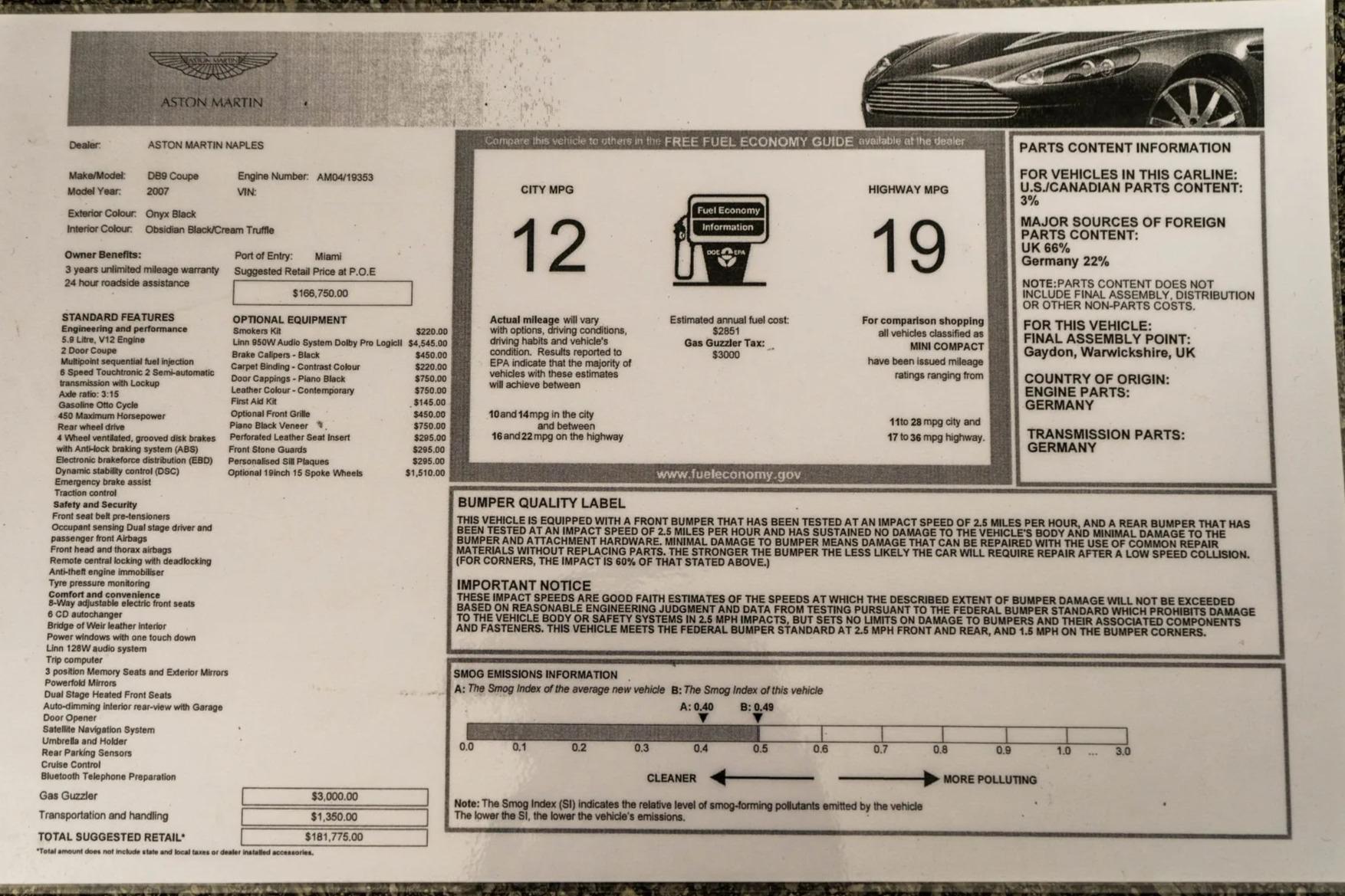 This 2007 Aston Martin DB9 Coupe was purchased new at Aston Martin of Naples, FL. The DB9 has lived in Florida during much of its life and then continued to be serviced at Aston Martin of Orlando. Previously sold by Autosport Designs Inc it has just been traded back in on another Aston Martin but this time a Volante. This DB9 has been kept in well-maintained condition throughout and is complete with its original factory books, service records, Keys, and Window sticker.