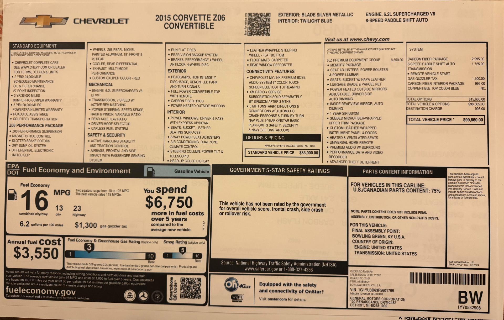 --Switch Blade Silver Metallic with Blue leather interior, Black carpeting and Blue convertible top, 6.2 Liter LT4 Supercharged V8 engine with 650 HP, 650 Ft-lbs of torque, 8-Speed Automatic transmission, 1,800 miles one owner from new, Exceptional throughout.